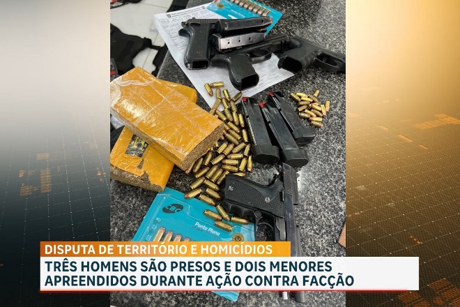 Com os investigados, a PM apreendeu cinco armas de fogo, seis coletes balísticos com placas, além de uma grande quantidade de drogas e munições.