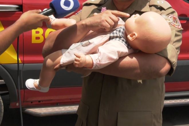 O tenente Sarges, do Corpo de Bombeiros ensinou a manobra de desengasgo lactente, que faz a desobstrução das vidas aéreas de crianças.