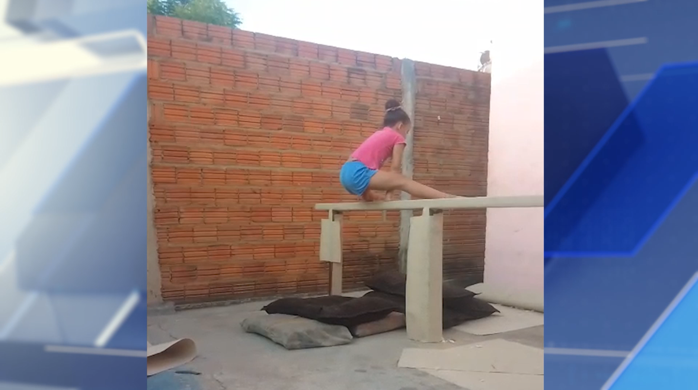 A pequena Sophya Lorrany, de 7 anos, está viralizando nas redes sociais com seus treinos improvisados de ginástica artística em casa.