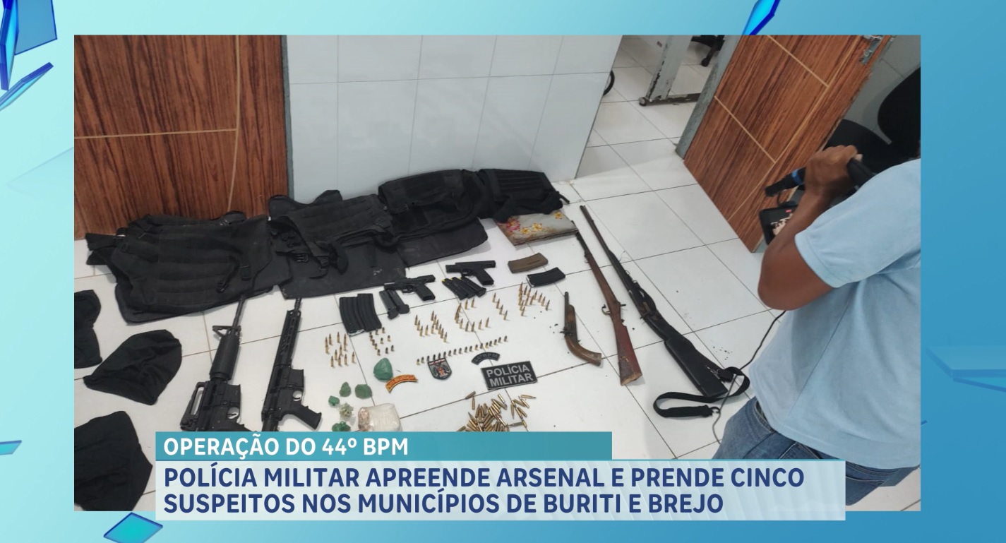 A Polícia Militar prendeu cinco pessoas nos municípios de Buriti e Brejo, no interior do Estado. Com eles os policiais encontraram várias armas de fogo, munições e coletes balísticos. Durante a ação, os suspeitos tentaram fugir, mas acabaram sendo capturados.