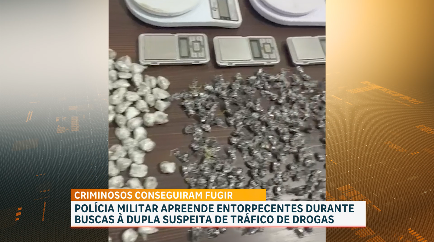 O material apreendido foi levado para a delegacia. Agora, a PM trabalha para localizar e prender os suspeitos.