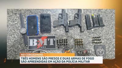 Policiais do 1°BMT realizaram a prisão de três suspeitos de portar duas armas de fogo e um carro roubado, no bairro Coroadinho. Segundo a polícia, um motorista de aplicativo teria fugido do cativeiro e o veículo estava com os captores.